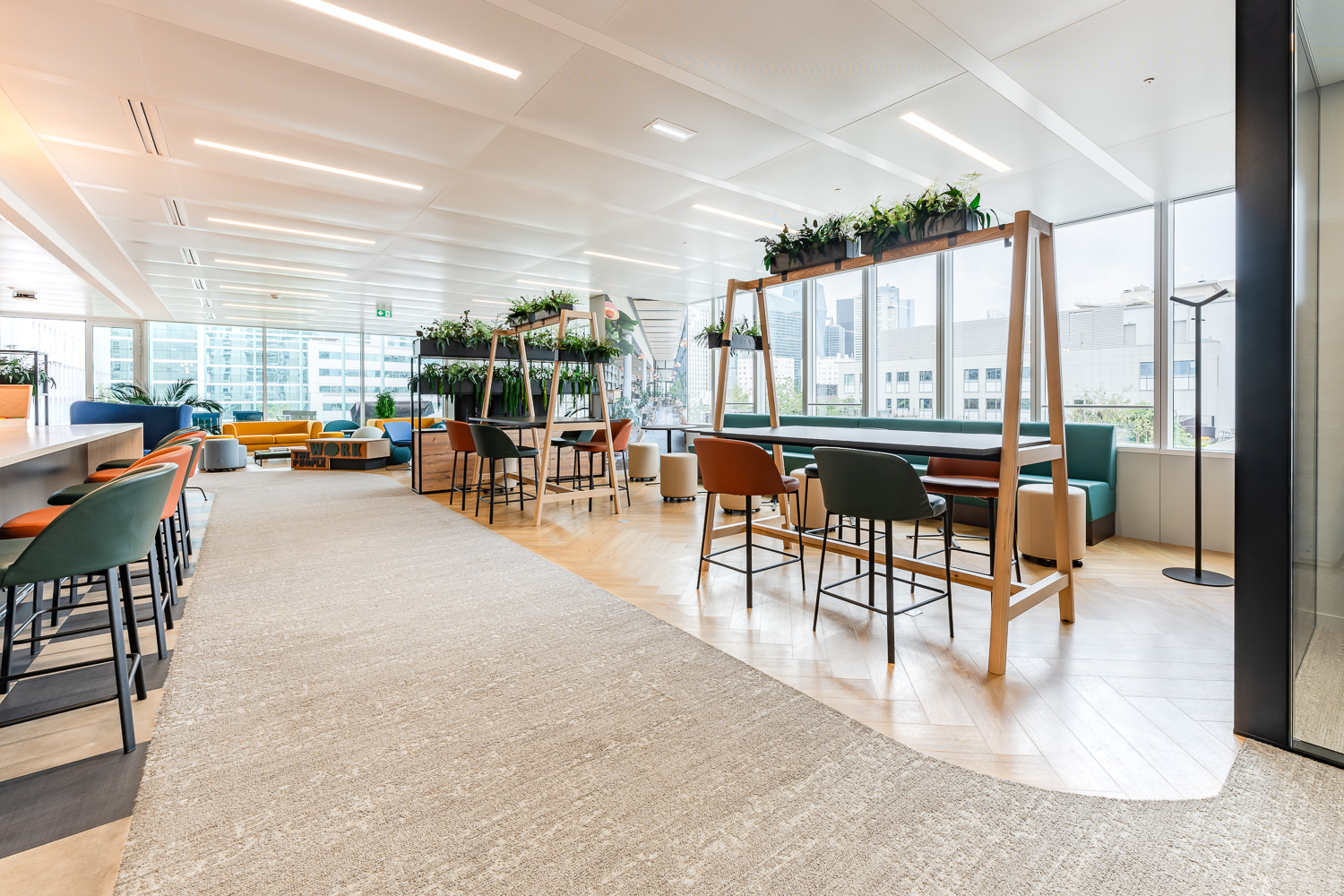 Nos architectes d’intérieur ont conçu un lieu à mi-chemin entre un restaurant, un hôtel, un café, un bar, un bureau et un espace chill. Les 900 m² proposent une diversité d’ambiances et de zones pour s’adapter à tous les modes de travail et moments de la journée : un espace bar convivial avec comptoir et tabourets hauts, des banquettes lounge pour les réunions informelles, des tables hautes pour le travail debout ou les déjeuners rapides, une grande table collaborative centrale pour le travail d’équipe, des postes de travail individuels avec bureaux ergonomiques, et des cabines acoustiques (callbox) pour les appels confidentiels. Un aménagement flex office pensé pour favoriser les échanges, la créativité et le bien-être des 50 collaborateurs.