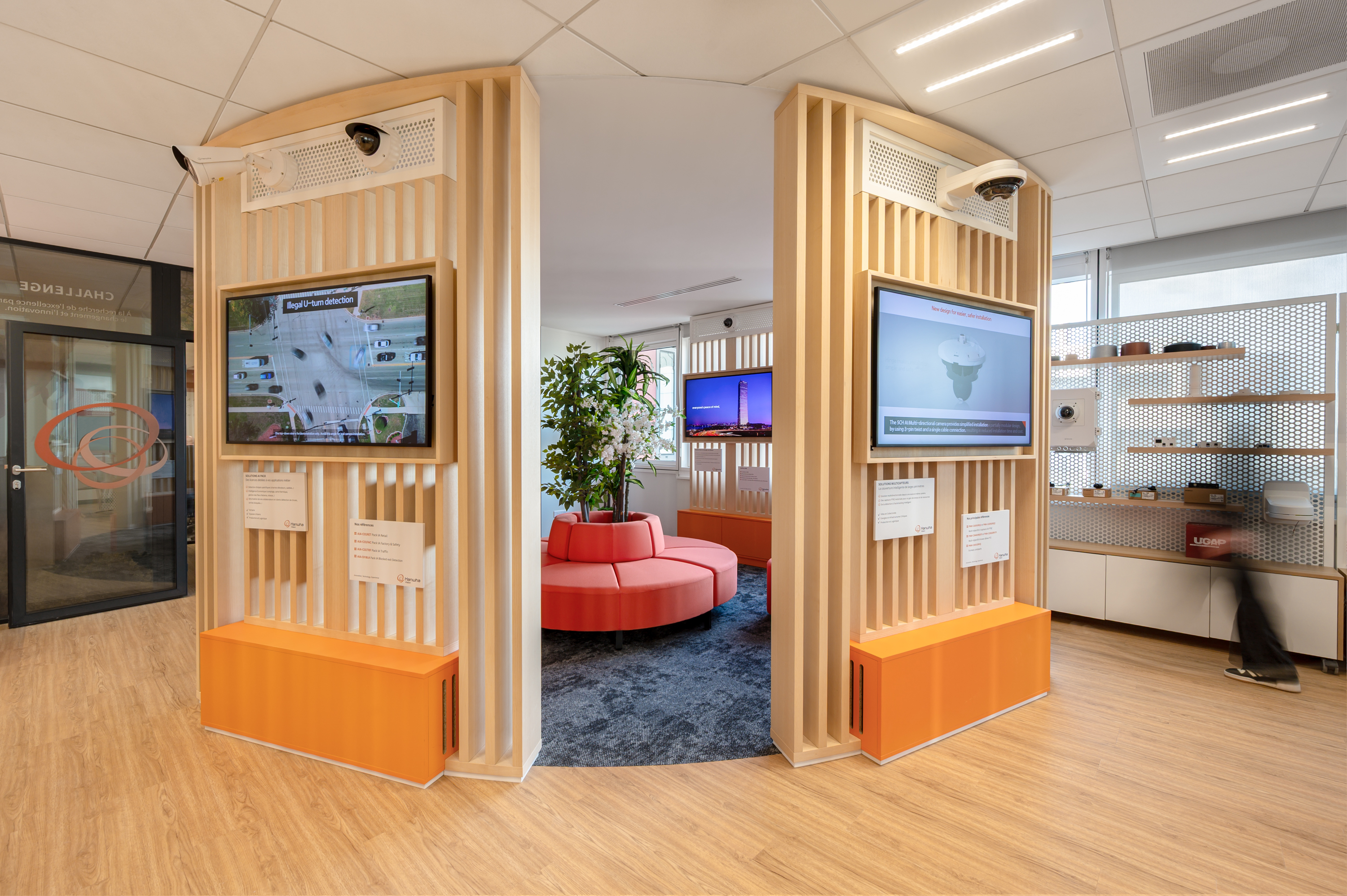 Les bureaux accueillent un accueil avec espace détente et cuisine, un open space collaboratif, un bureau de direction, une salle de réunion modulaire, un bureau tech et un laboratoire technique pour les tests et démonstrations. Une salle de formation complète le dispositif, permettant à Hanwha Vision de former ses partenaires directement sur site.