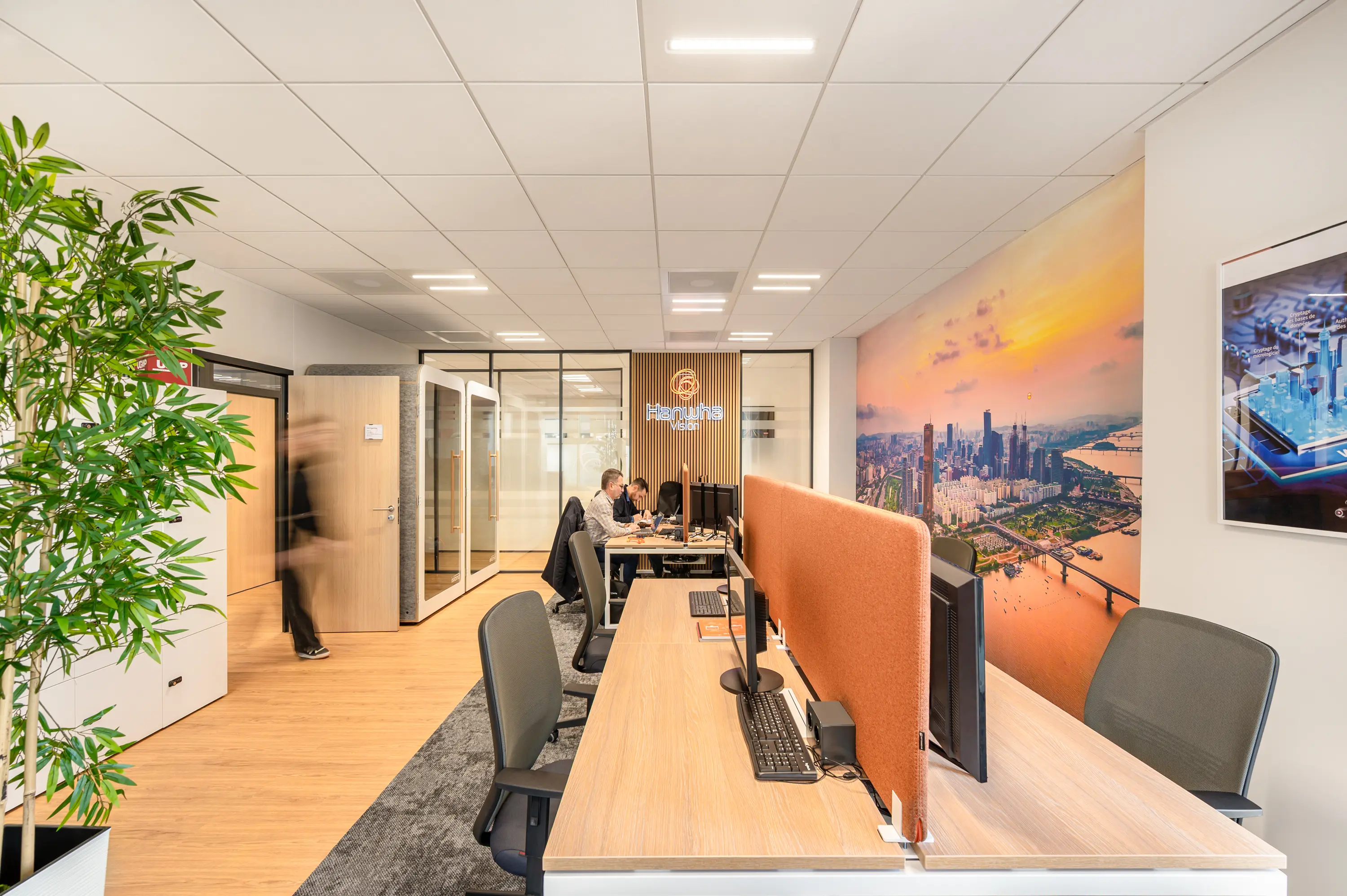 Les bureaux accueillent un accueil avec espace détente et cuisine, un open space collaboratif, un bureau de direction, une salle de réunion modulaire, un bureau tech et un laboratoire technique pour les tests et démonstrations. Une salle de formation complète le dispositif, permettant à Hanwha Vision de former ses partenaires directement sur site.