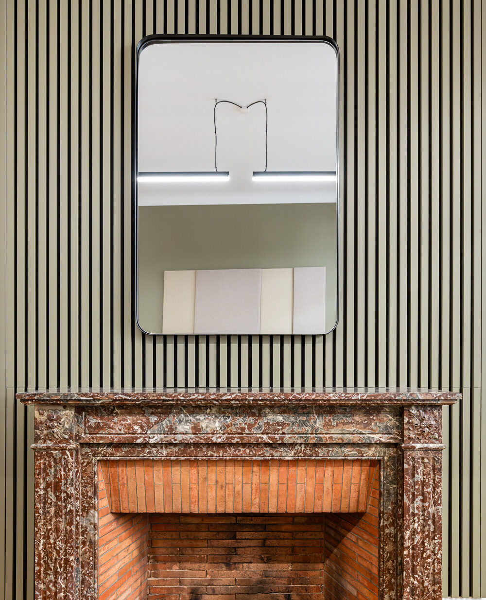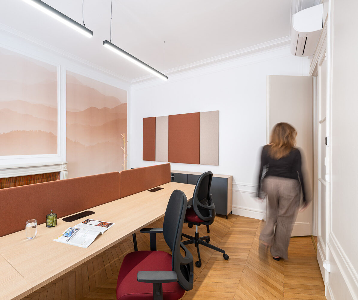 Les 343 m² rénovés accueillent désormais un open space lumineux avec traitement acoustique plafond et cloisons (indispensable pour la concentration en expertise comptable), des bureaux privatifs pour les associés et rendez-vous clients confidentiels, des salles de réunion équipées en visioconférence, et un espace détente avec cuisine aménagée favorisant la convivialité. Le mobilier professionnel et la décoration soignée créent un environnement élégant qui reflète le standing d’Axia Consultants. Le mariage est réussi entre moulures Haussmanniennes, hauteur sous plafond d’époque, espaces rénovés, et équipements modernes (éclairage LED, câblage informatique, acoustique).