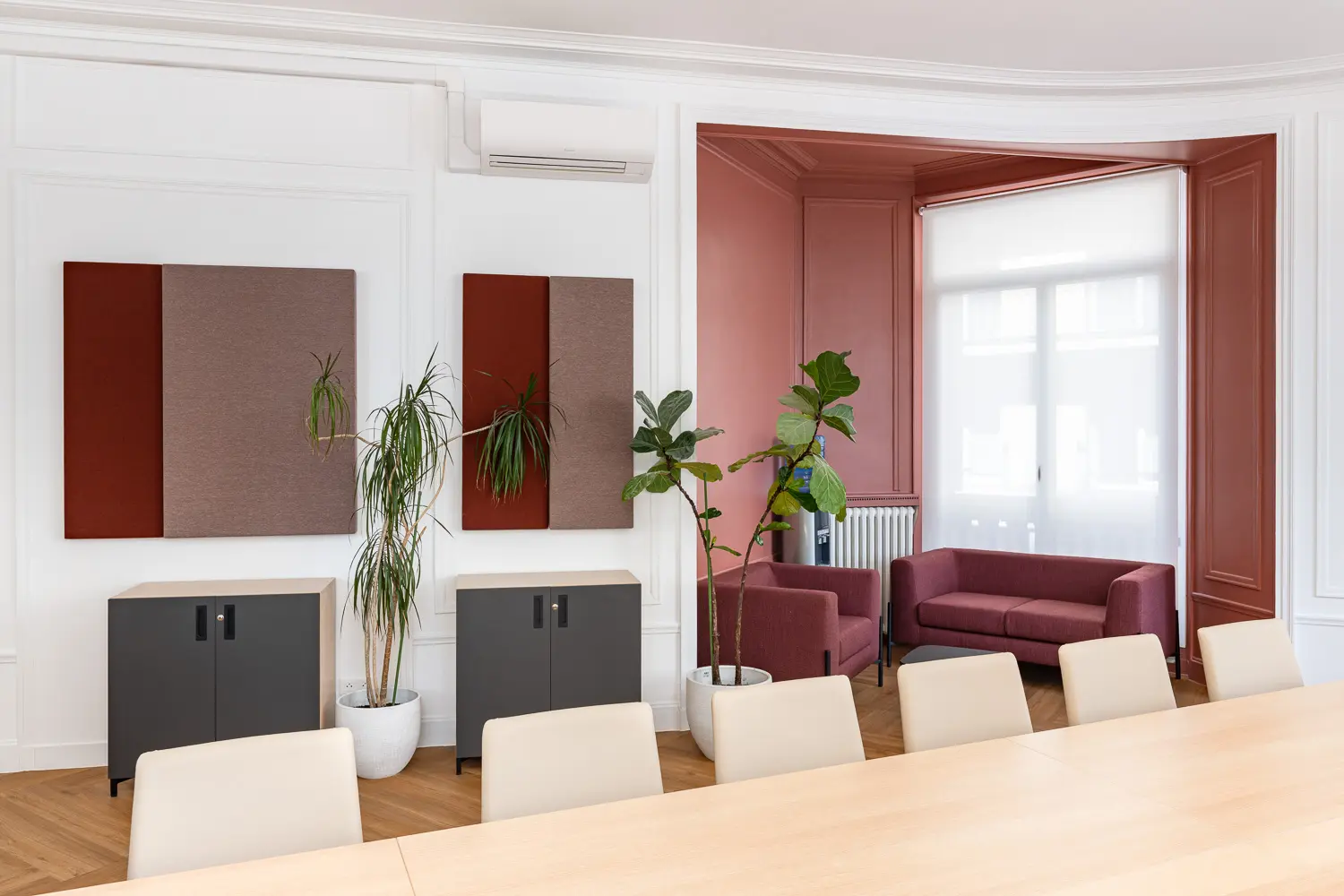 Les 343 m² rénovés accueillent désormais un open space lumineux avec traitement acoustique plafond et cloisons (indispensable pour la concentration en expertise comptable), des bureaux privatifs pour les associés et rendez-vous clients confidentiels, des salles de réunion équipées en visioconférence, et un espace détente avec cuisine aménagée favorisant la convivialité. Le mobilier professionnel et la décoration soignée créent un environnement élégant qui reflète le standing d’Axia Consultants. Le mariage est réussi entre moulures Haussmanniennes, hauteur sous plafond d’époque, espaces rénovés, et équipements modernes (éclairage LED, câblage informatique, acoustique).